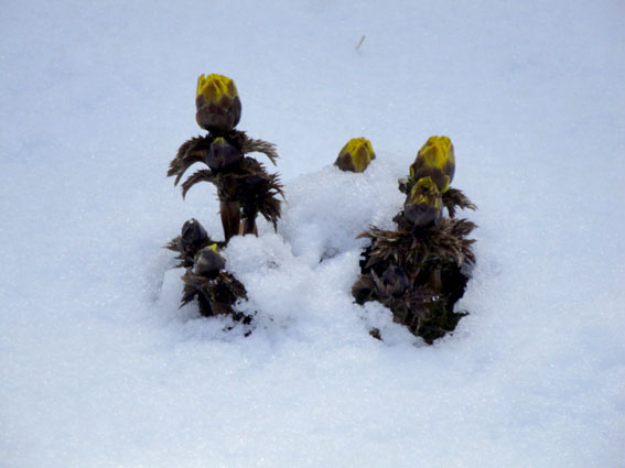 積もった雪はその日のうちに殆ど解けてしまったが、庭の所々には、まだ少し雪が残っている。その雪の間から、そろそろ顔を出しても構わないかなというような表情の蕗の薹や福寿草。まるで雪国で春を迎えた感じである。