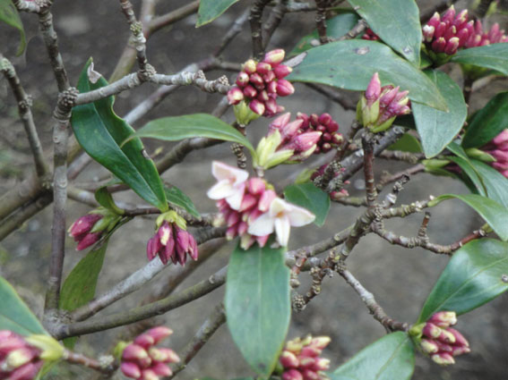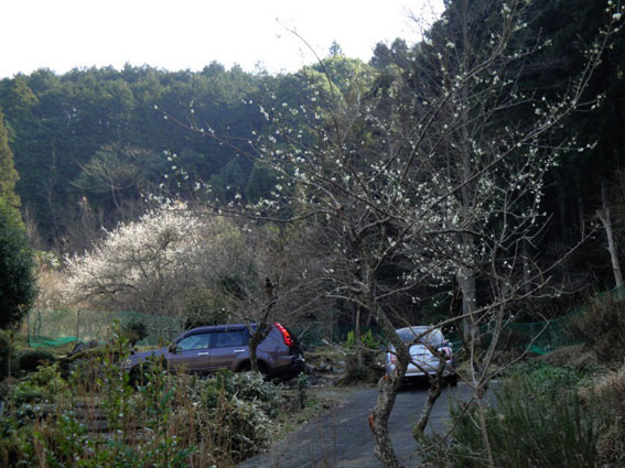 バカ陽気に誘われ裏山の梅は一気に満開となりました。沢沿いの白梅「月影」も日陰にも拘らず、かなり頑張って咲いています。梅の香りが庭一杯に漂う中、何処からともなく違う匂いもしてきました。きっとあの花だと思いながら、その香りを辿るとやはり沈丁花が梅に負けじと紅の蕾を二つほど開いていました。自己主張の強い匂いですが、今日のところは、まだ、控えめで虫はまだ寄ってきていませんでした。